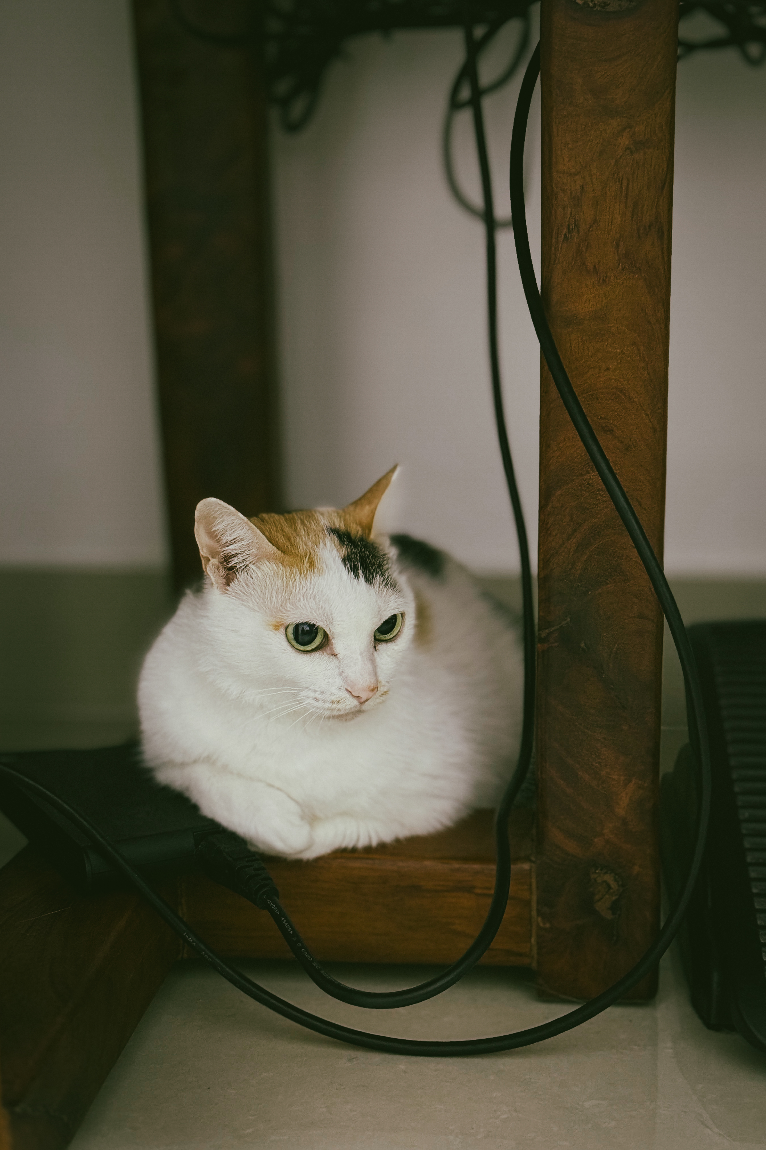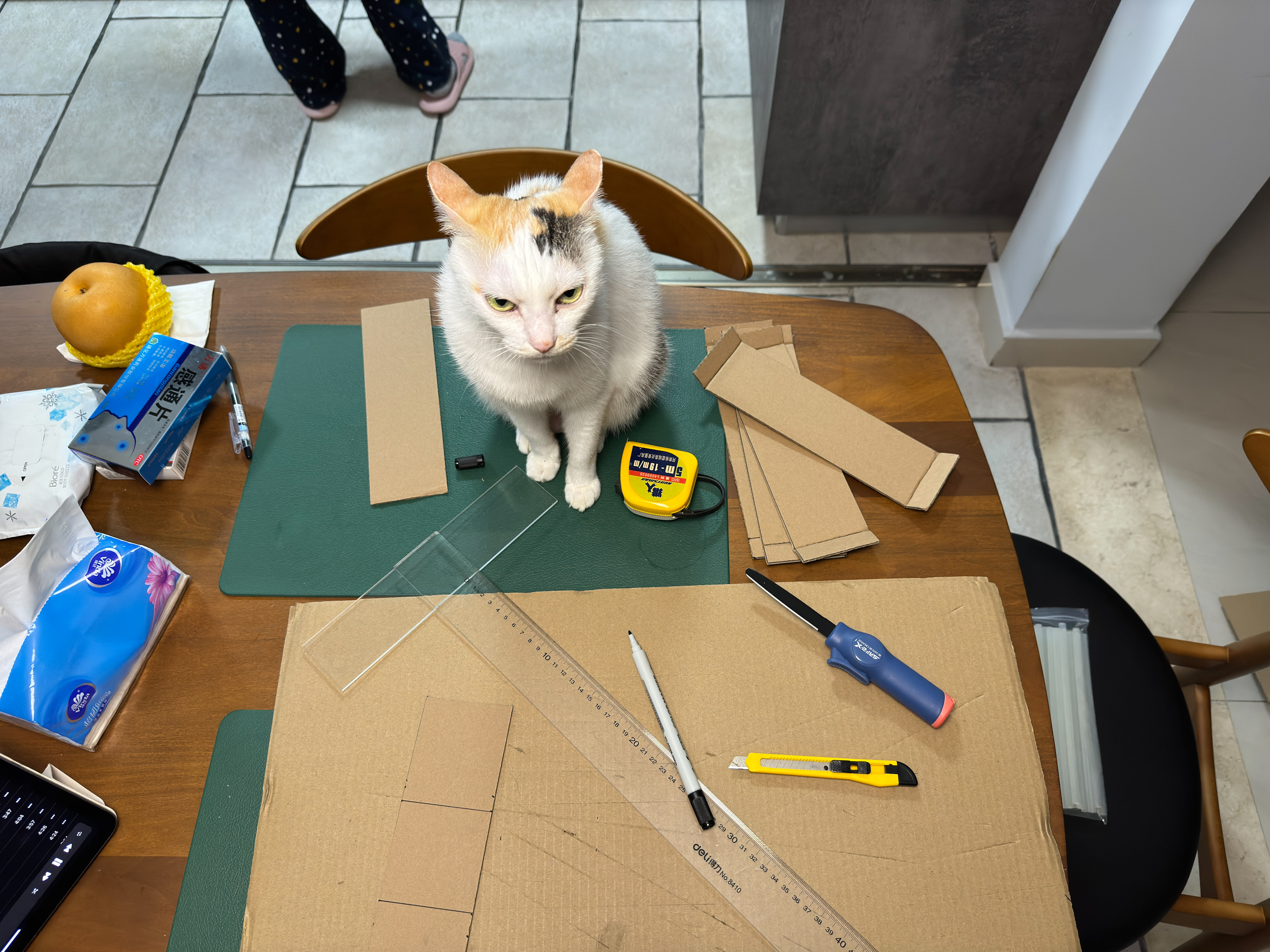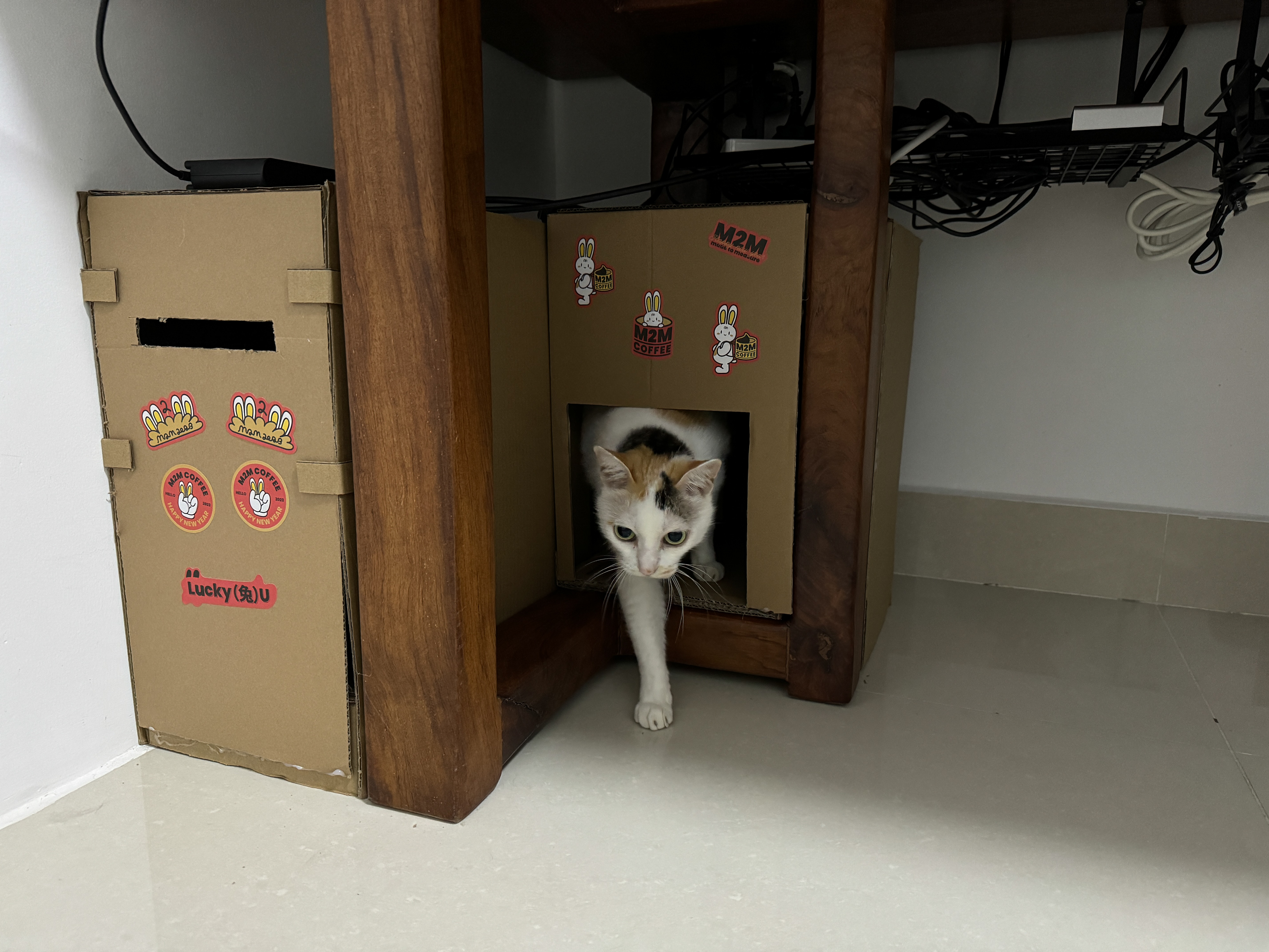 前些时候有几天经常打雷,我就观察肉肉到底要往哪里躲,最后发现她最终选择的是电视机背后,我担心她把电视机推到就把她给弄了出来,最终她趴在了我的书桌下,如下图👇,趴了很久,两只眼睛还一直盯着阳台的方向,十分警惕。看的老父亲我心生愧疚,于是想给她在这个位置做一个安全屋,希望下次有什么要她命的情况她能想起来有个地方躲藏。