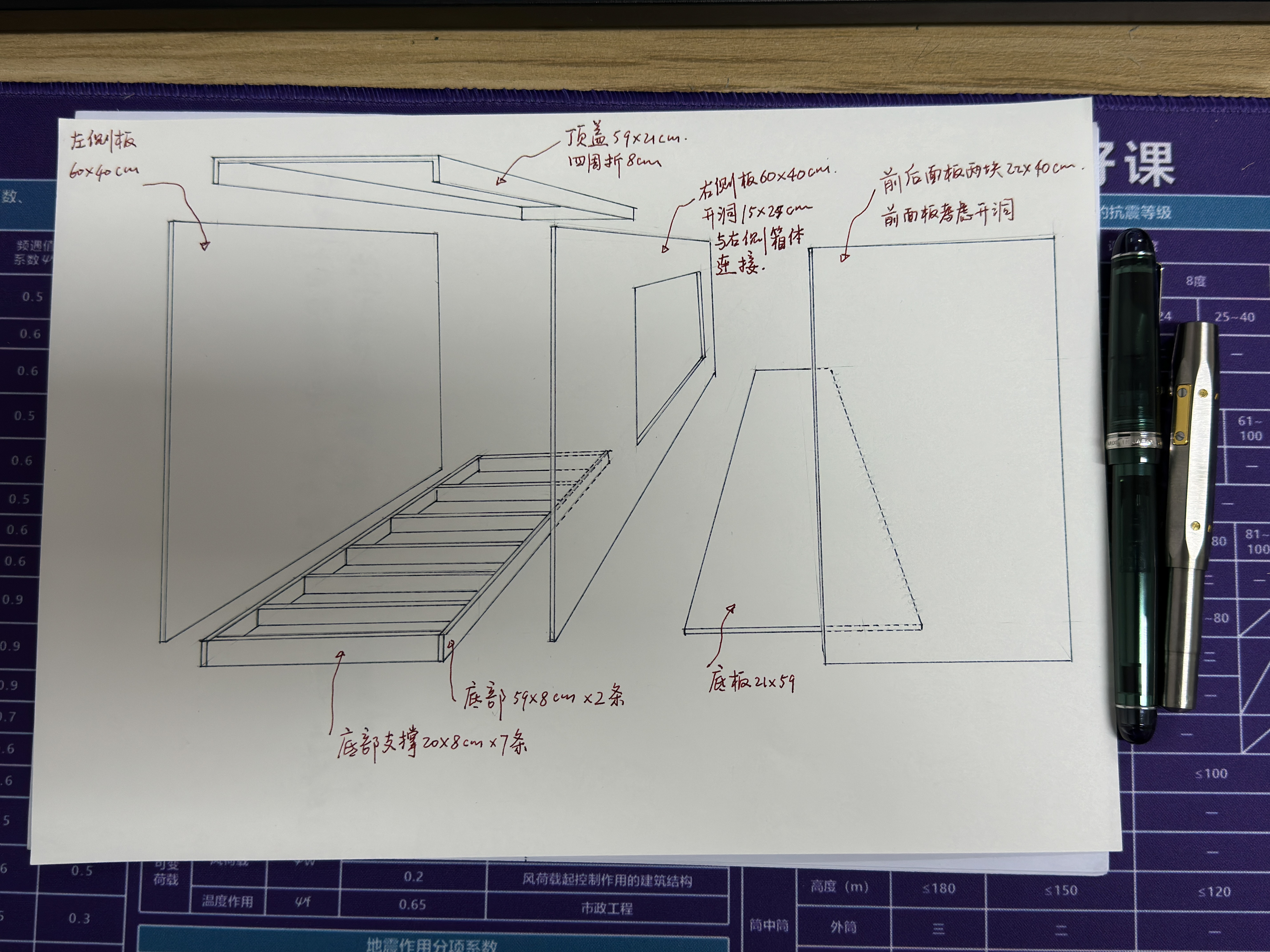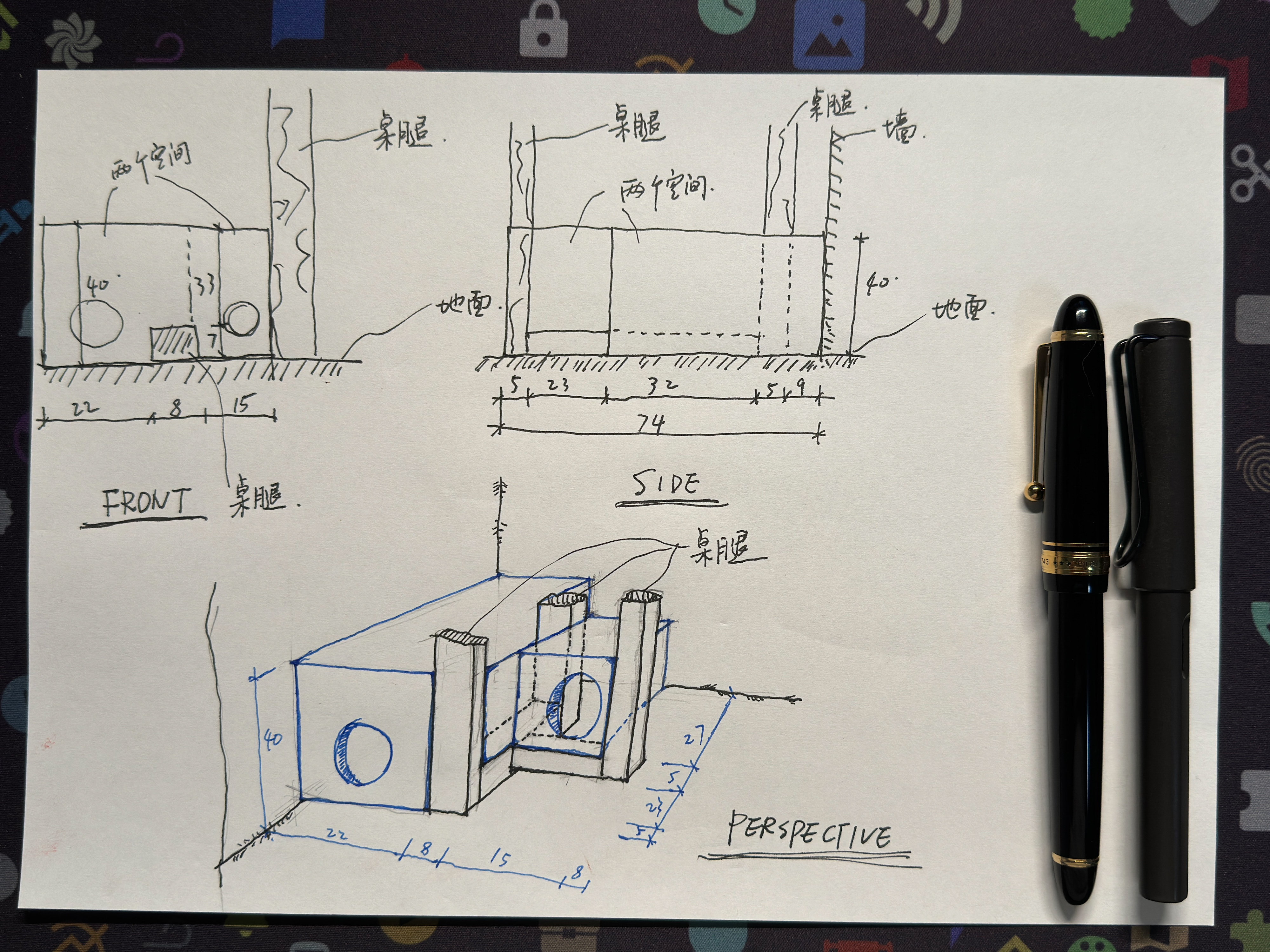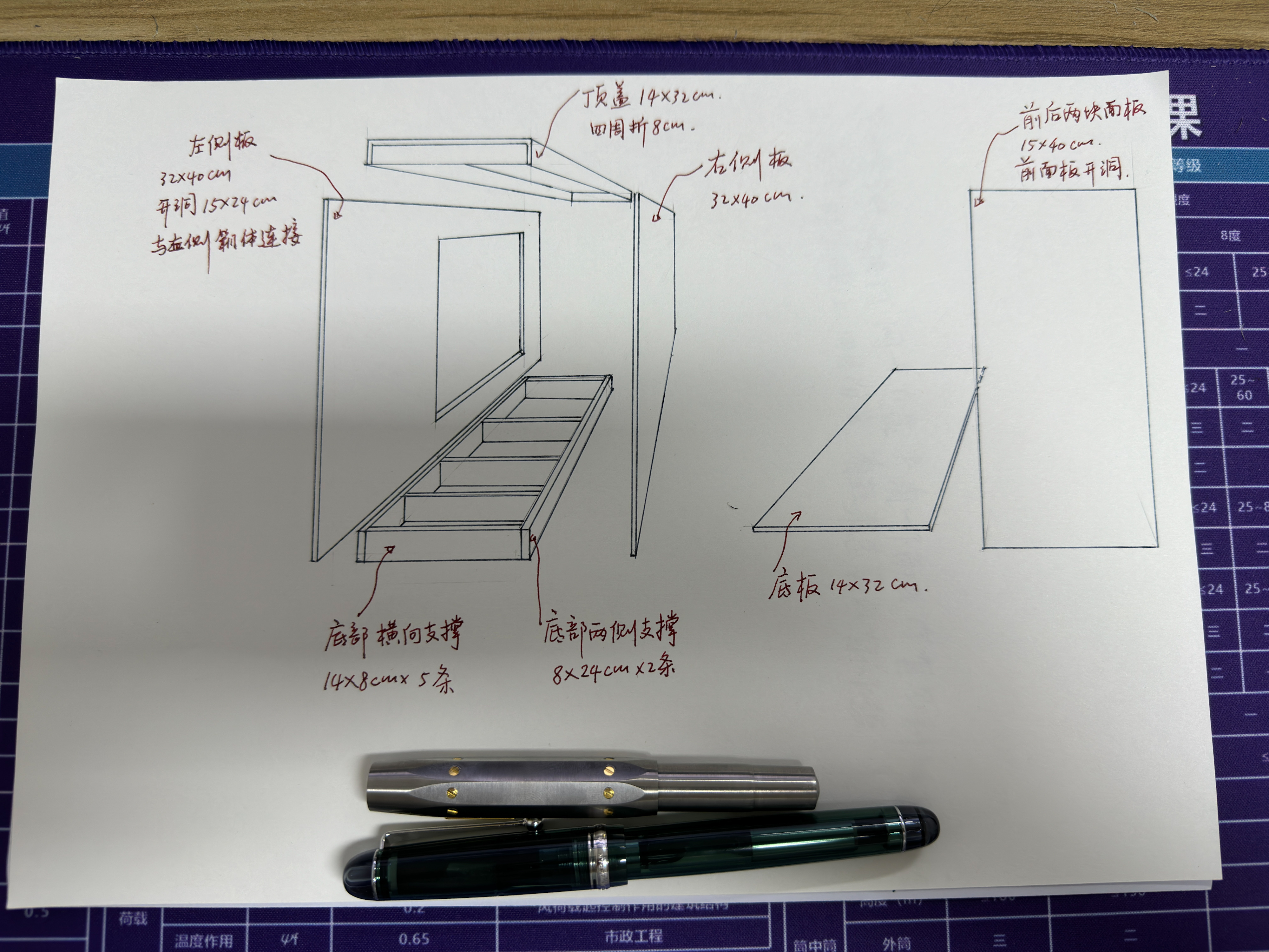 当晚我就量尺寸随手画了一个图,大致的想法就是利用桌下空间,做两个盒子,互相连接,猫进入后还要拐个弯,这样感觉可能会更加安全(我在尽量揣摩猫的心里🤔)。