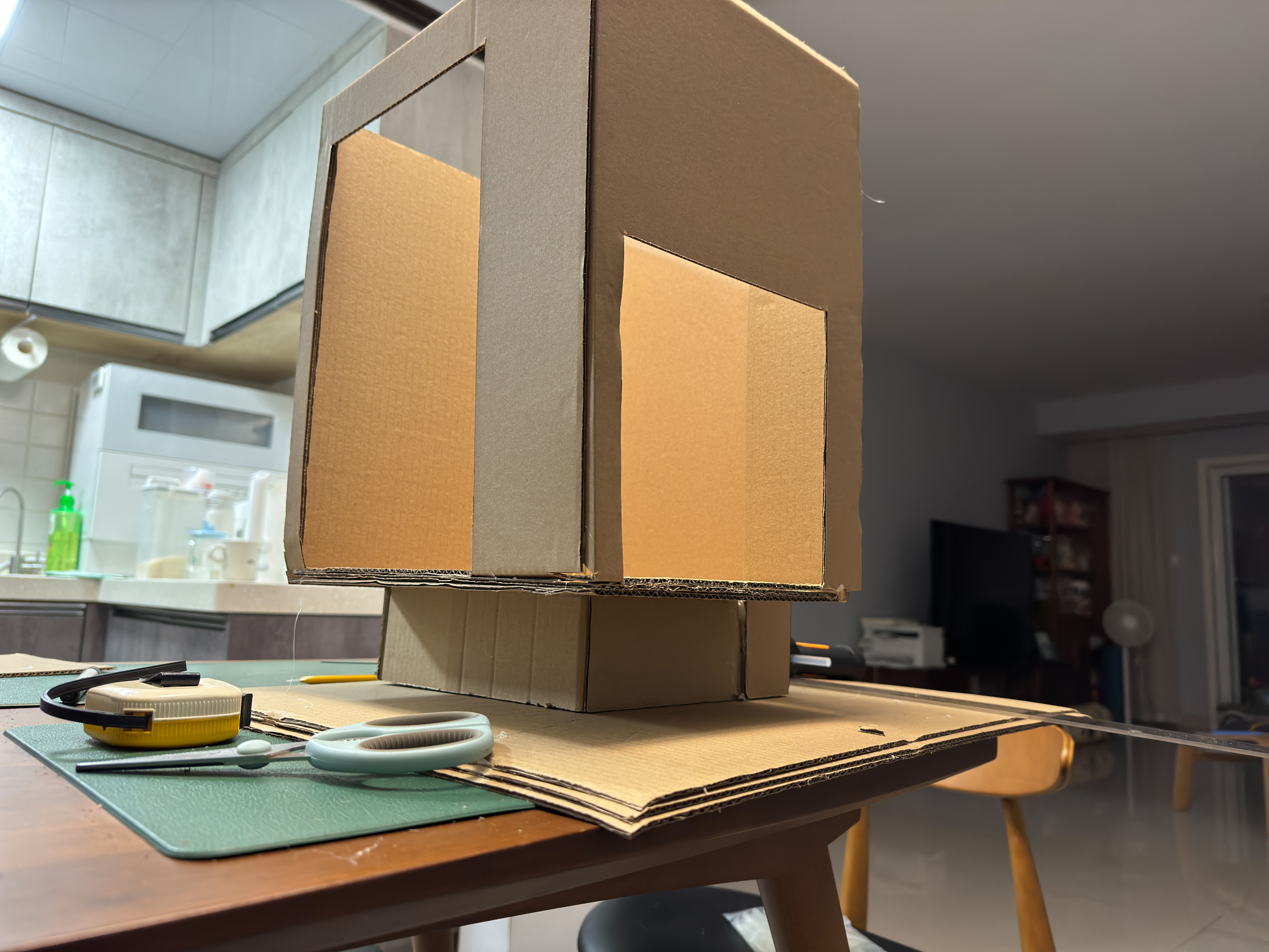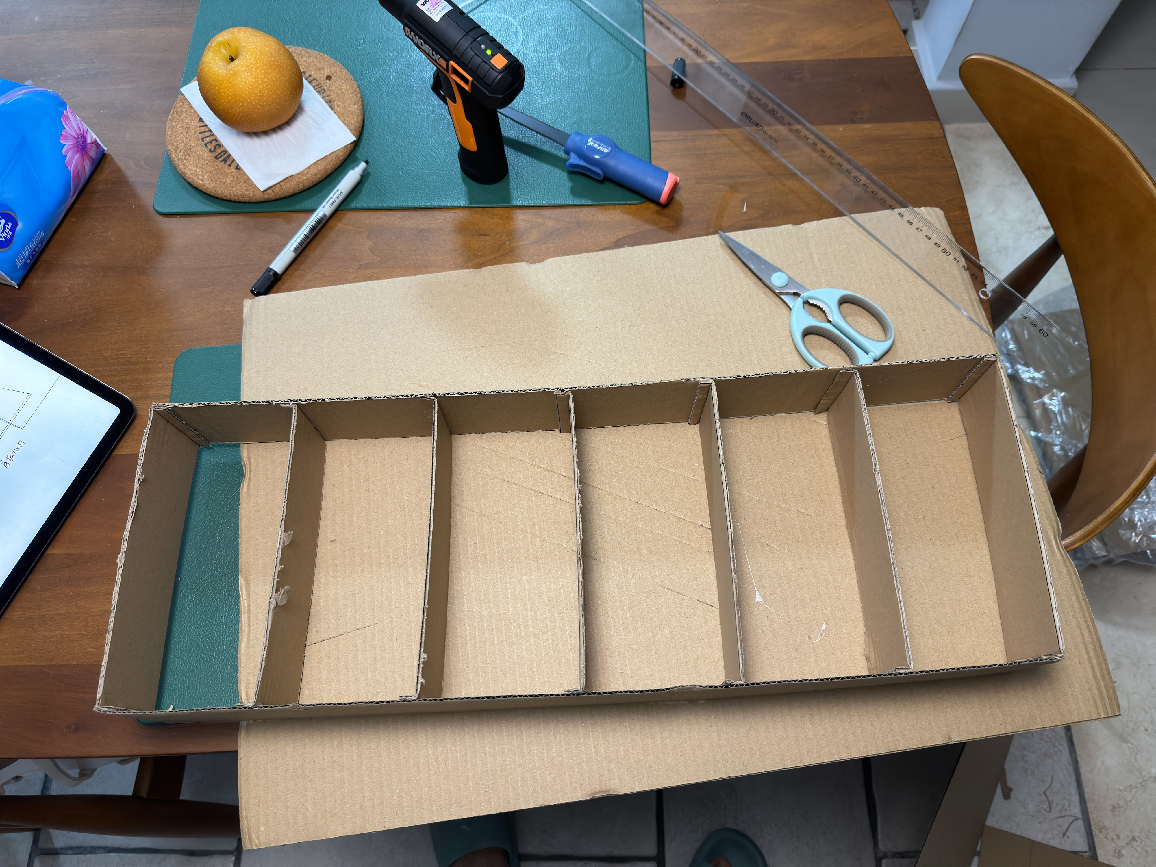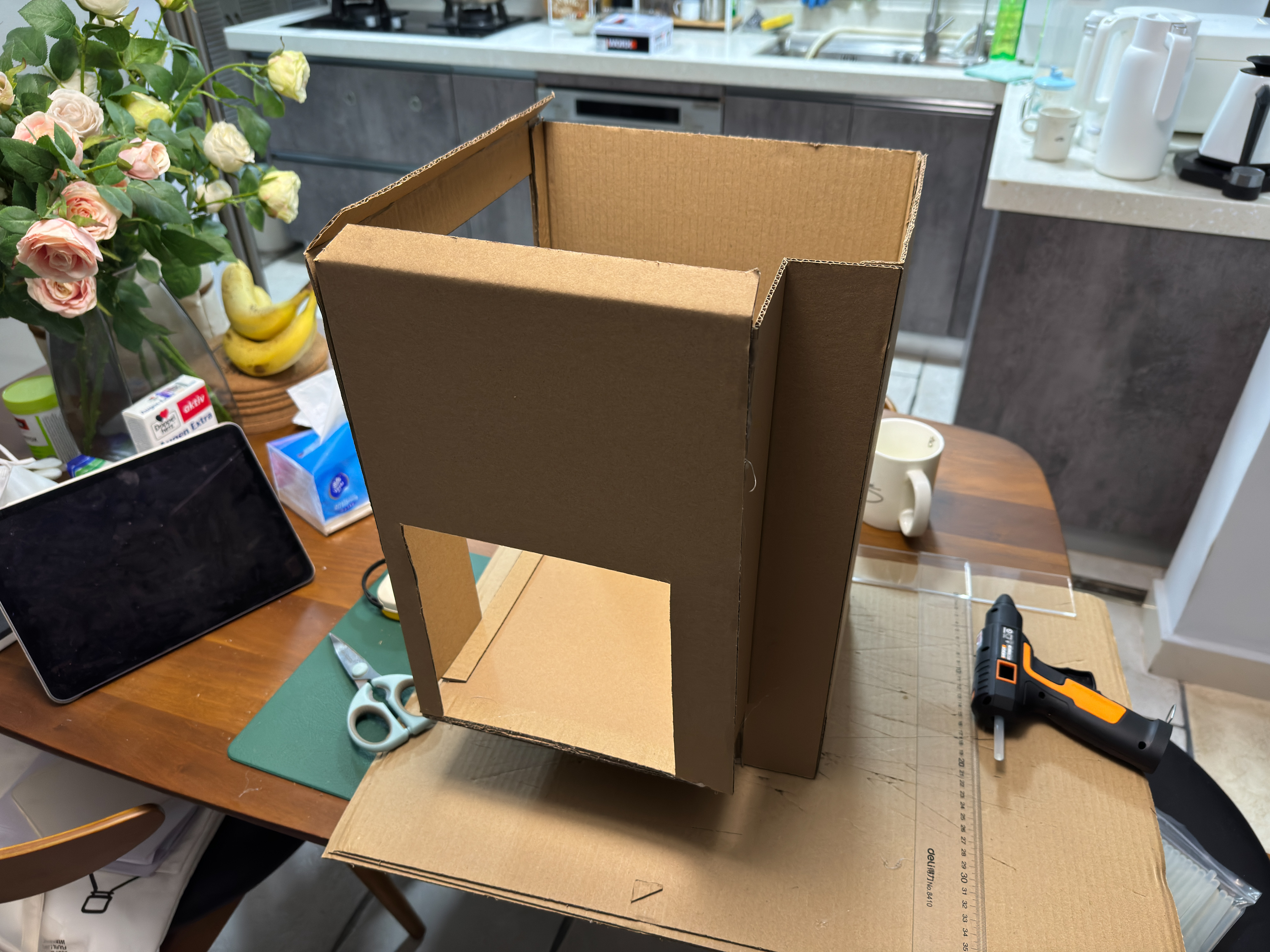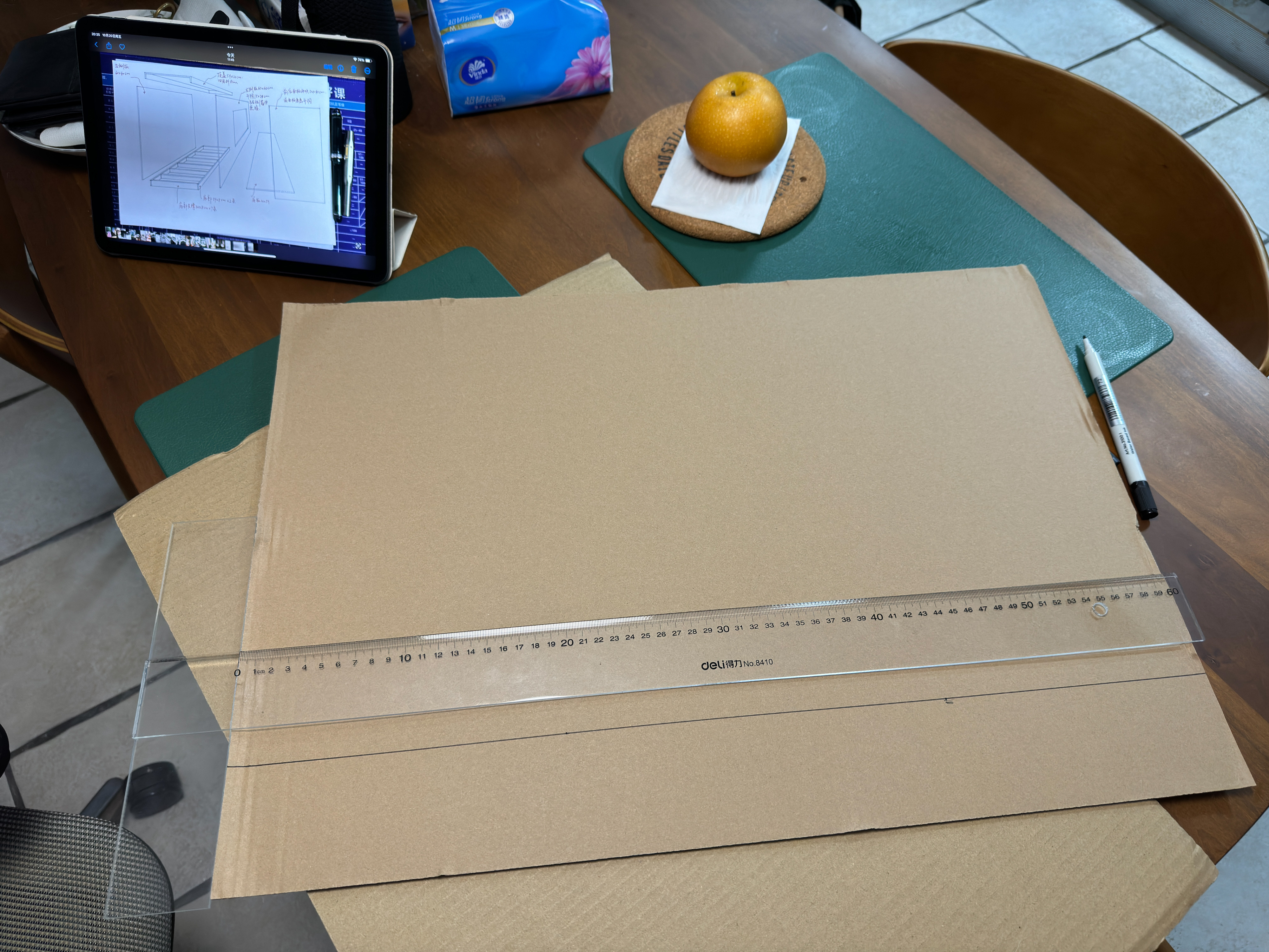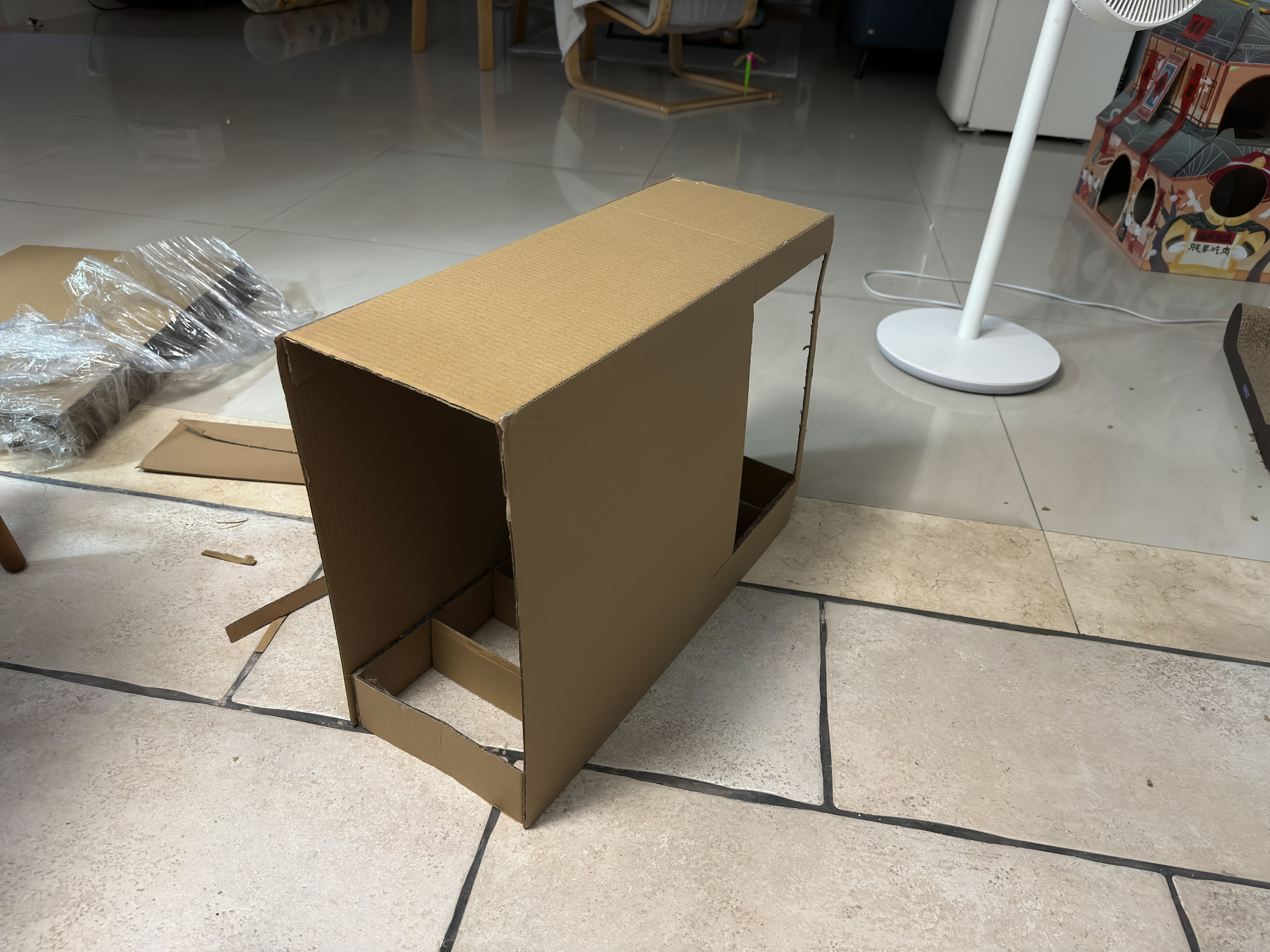尺寸,尺寸,还是尺寸,画图的时候只考虑了外轮廓尺寸,并没有考虑纸板本身厚度,尤其是纸板与纸板粘贴后就更厚了,左侧的纸箱完成后发现放不进去,后来是用蛮力塞进去的,而右侧的纸箱由于桌腿的原因无法直接从侧面推入,而是要绕着桌腿旋入,比较考验空间想象力,实际制作过程中返工了一次,修改了尺寸才安装好;