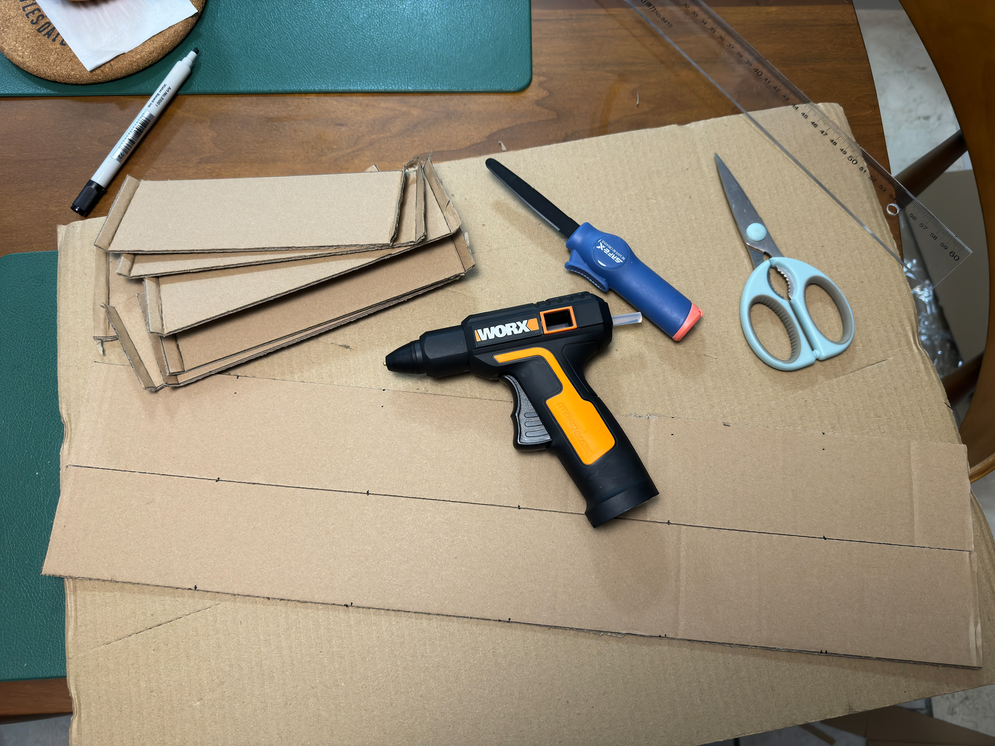 所有纸板都是用热熔胶粘连的,这东西干的速度比我想象的快很多,如果粘一块比较长的板,有可能打胶打到后面,前面的已经干了。