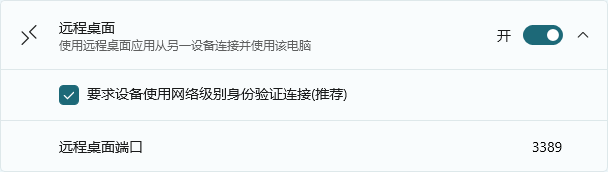 被远程操控的电脑在“系统设置-远程桌面”里打开远程访问,并勾选“要求设备使用网络级别身份验证连接(推荐)”,端口不变。