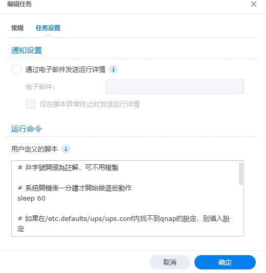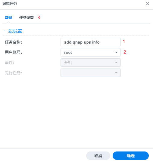 这一步是要将威联通的信息写入群晖的ups配置文件中,因为群晖每次开机(升级系统)会还原/etc.defults/文件,所以要设置一个开机触发任务来保证保证每次开机都会将威联通的信息写入ups配置中。