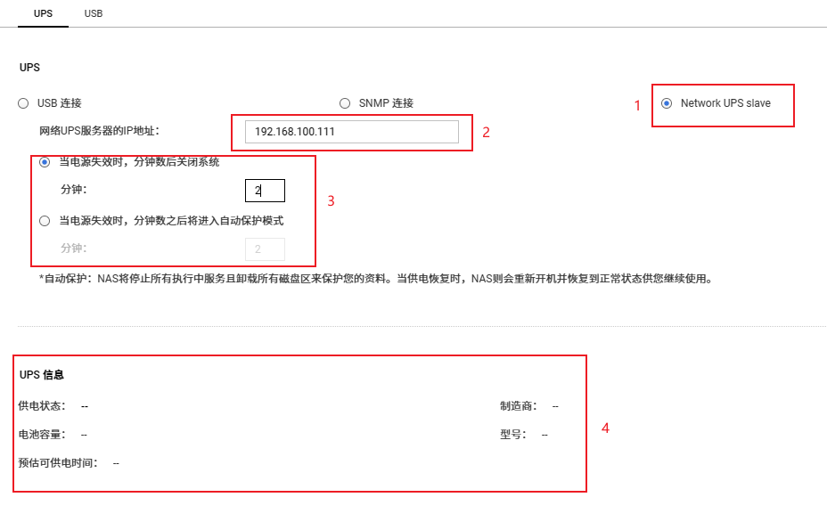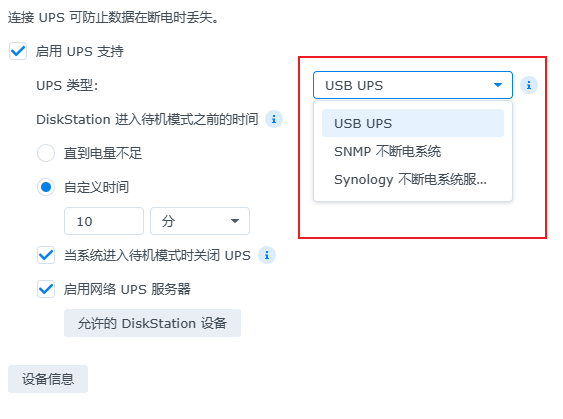 如上图所示,先在群晖的不断电系统进行设置,将群晖通过usb连接到ups: