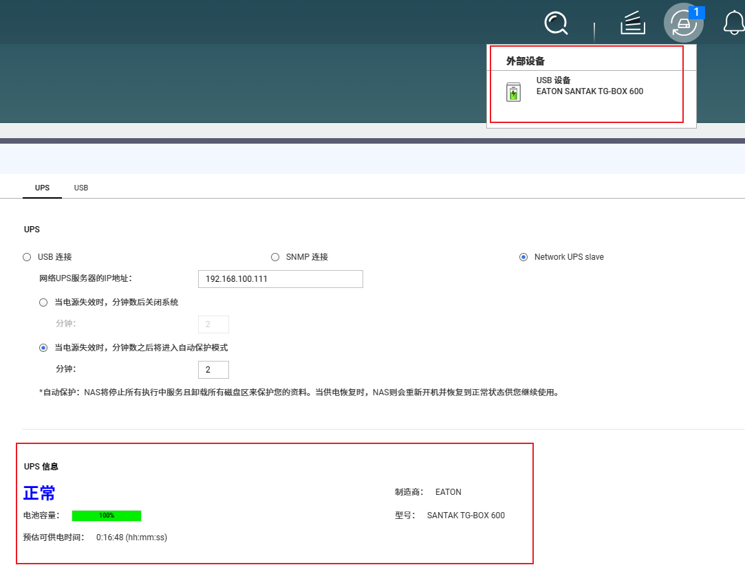 完成以上设置后就可以将群晖NAS重启,重启完成后过几分钟就可以看到威联通NAS里就已经出现了ups信息,并且也出现了连接上ups的标志。