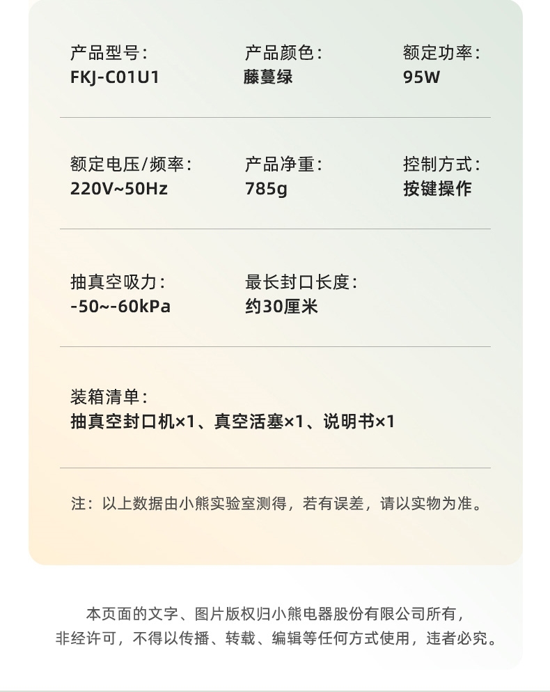 我家这个是小熊牌的,型号 FKJ-C01U1,功能包括“干抽+封口”、“湿抽+封口”、“外部抽真空”、“仅封口”,对应着机器上的四个按钮,直接点按就可以启动相应的功能,最右侧还有一个停止键,以防意外,左侧圆形窗口对应着压力值,应该为“负值”,不过显示的是正值。下面是官方参数: