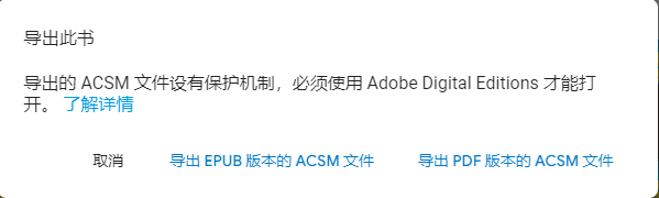 打开网页版Google play,找到购买的电子书,点击书旁边的三个点显示菜单,导出需要的格式,此时下载的并非电子书而是一个.acsm文件,这个文件包含了电子书的下载信息;
