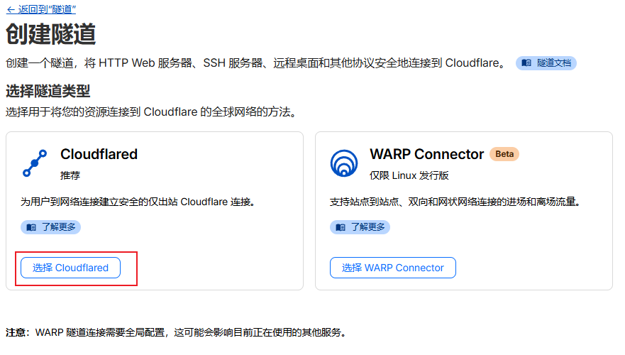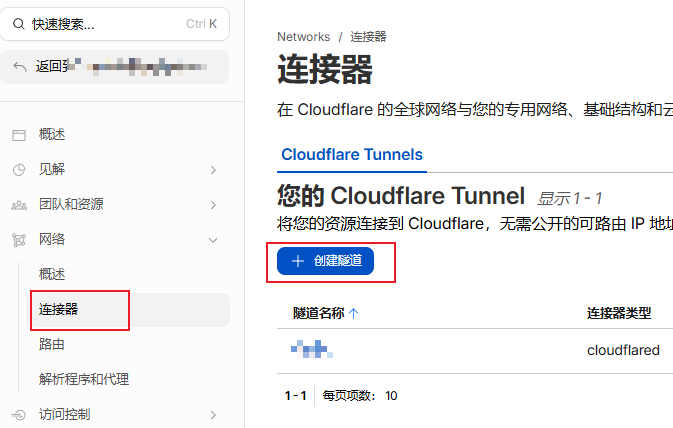 在cloudflare左侧菜单里找到“Zero Trust-网络-连接器”,在右侧页面选择创建隧道;