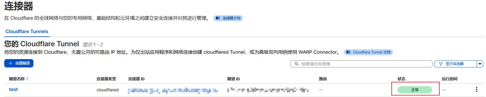 回到cloudflare页面,现在可以看到刚设置的连接器已经显示连接成功了,至此隧道已经创建成功。