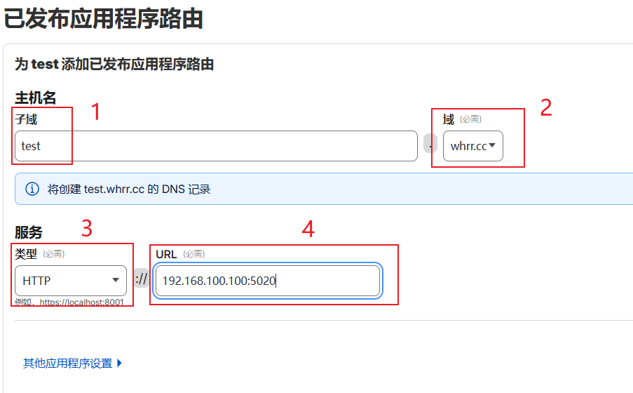 按下图所示填写需要穿透的服务,1处填写你需要的二级域名;2处选择你已经托管到cloudflare的域名;3处是NAS上的服务协议(一般为http);4处是NAS上的服务IP地址+端口号。填写完保存就行了;