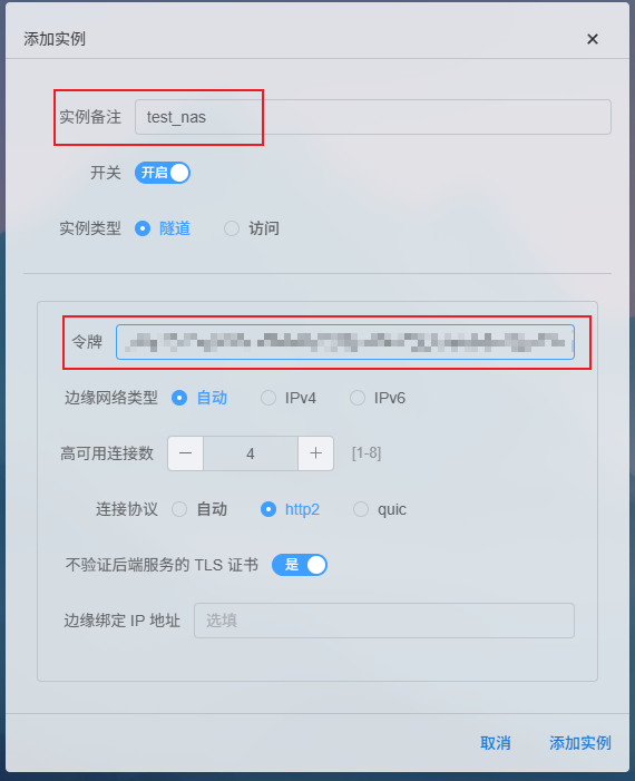 接下来的界面,实例备注随便填,令牌处填入上一步中从cloudflare中拷贝的令牌,其他保持默认,点击添加实例