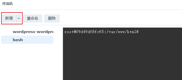 我是用docker安装的wordpress,所以打开docker,在wordpress创建的容器处打开终端机,点击左上角的新增