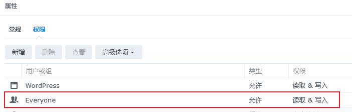 上传文件的时候出现 wordpress 无法将上传的文件移动至 wp-content/uploads/ 错误提示,因为玩NAS也有几年了,所以看到这个错误我立马就想到了是容器映射到本地的文件夹权限不够导致的,问题是应该如何修改权限呢?经过尝试,给文件夹增加everyone 的读写权限即可。